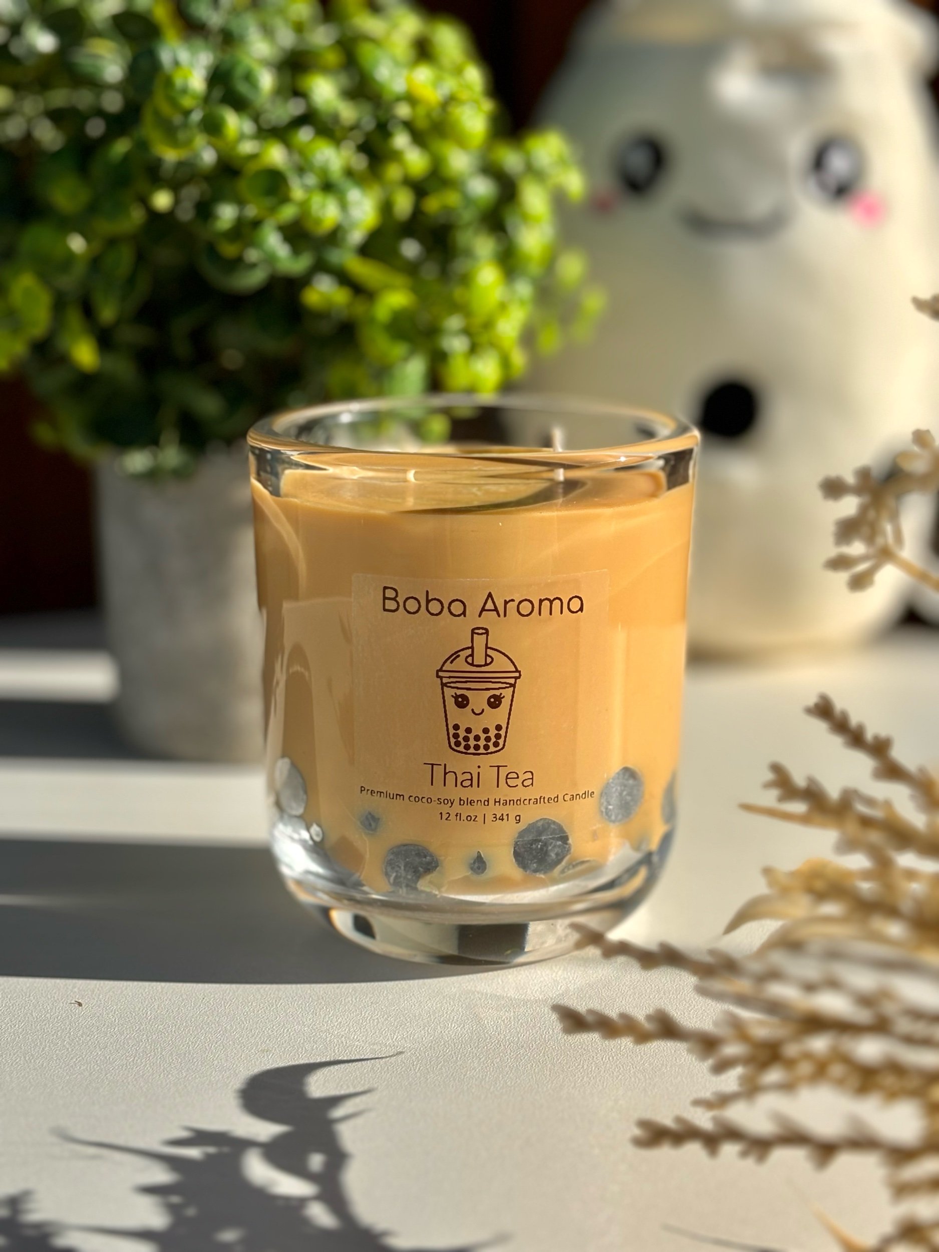 Hand-poured using a premium coconut soy wax blend and finished with signature boba pearl detailing, this candle fills your space with a cozy, inviting glow and a quietly luxurious warmth.